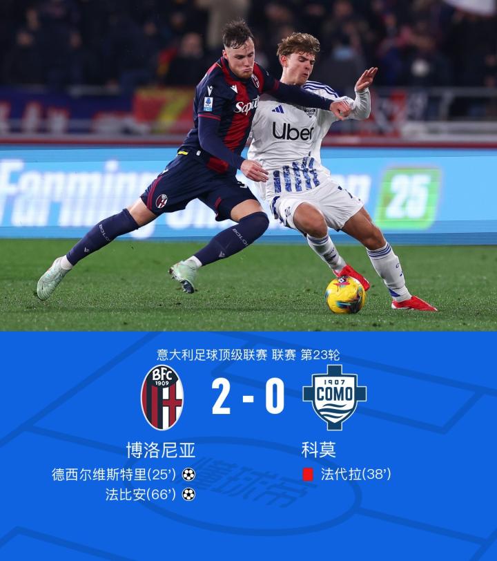 虽然科莫队在比赛的最后时刻还展现了一些进攻威胁,但博洛尼亚队在场上表现出色,稳固的防守和精准的进攻策略让他们成功守住了领先优势,最终以2-0的比分取得了胜利。这场胜利不仅为博洛尼亚队赢得了三分,也增强了球队的信心和士气。