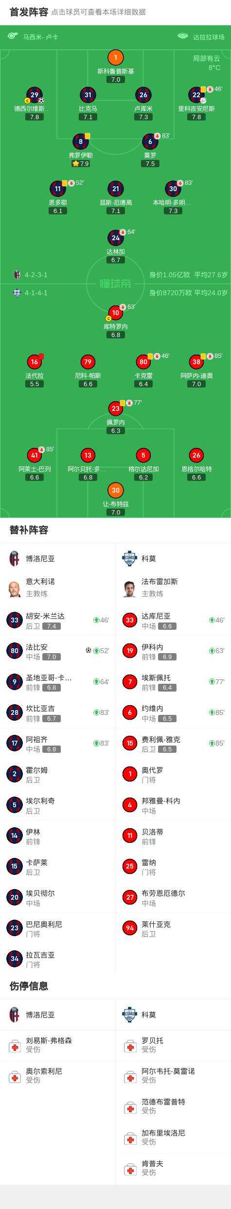 随着比赛进行,博洛尼亚队在第38分钟又获得了一次得利机会。然而,科莫队员法代拉因因不满裁判判罚,接连两次收到黄牌被罚下场,使得科莫队不得不承受十人作战的困境。这使得博洛尼亚队的优势更加显而易见。